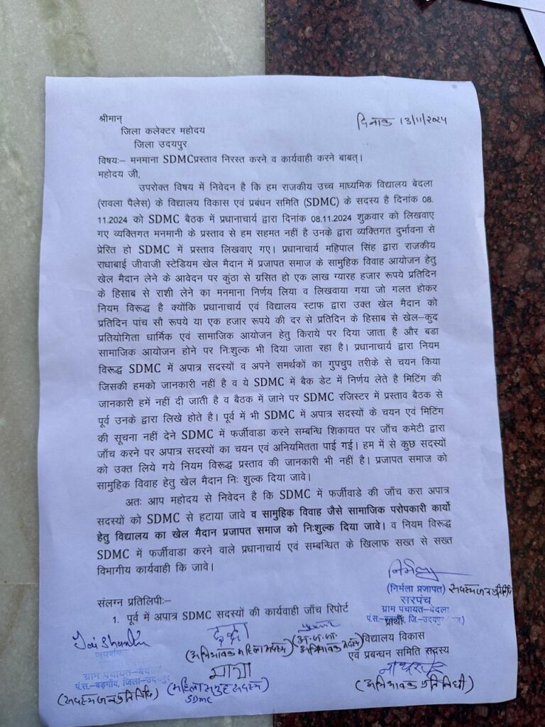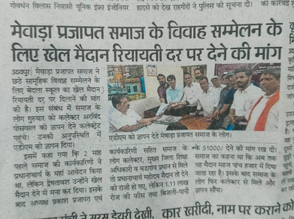 प्रजापत ( कुम्हार) के छठे सामुहिक विवाह सम्मेलन हेतु बेदला खेल मैदान उपलब्ध ना करवाए जाने पर आंदोलनरत कार्यकारिणी एंव समाजजन। कलेक्टर पर धरना ज्ञापन